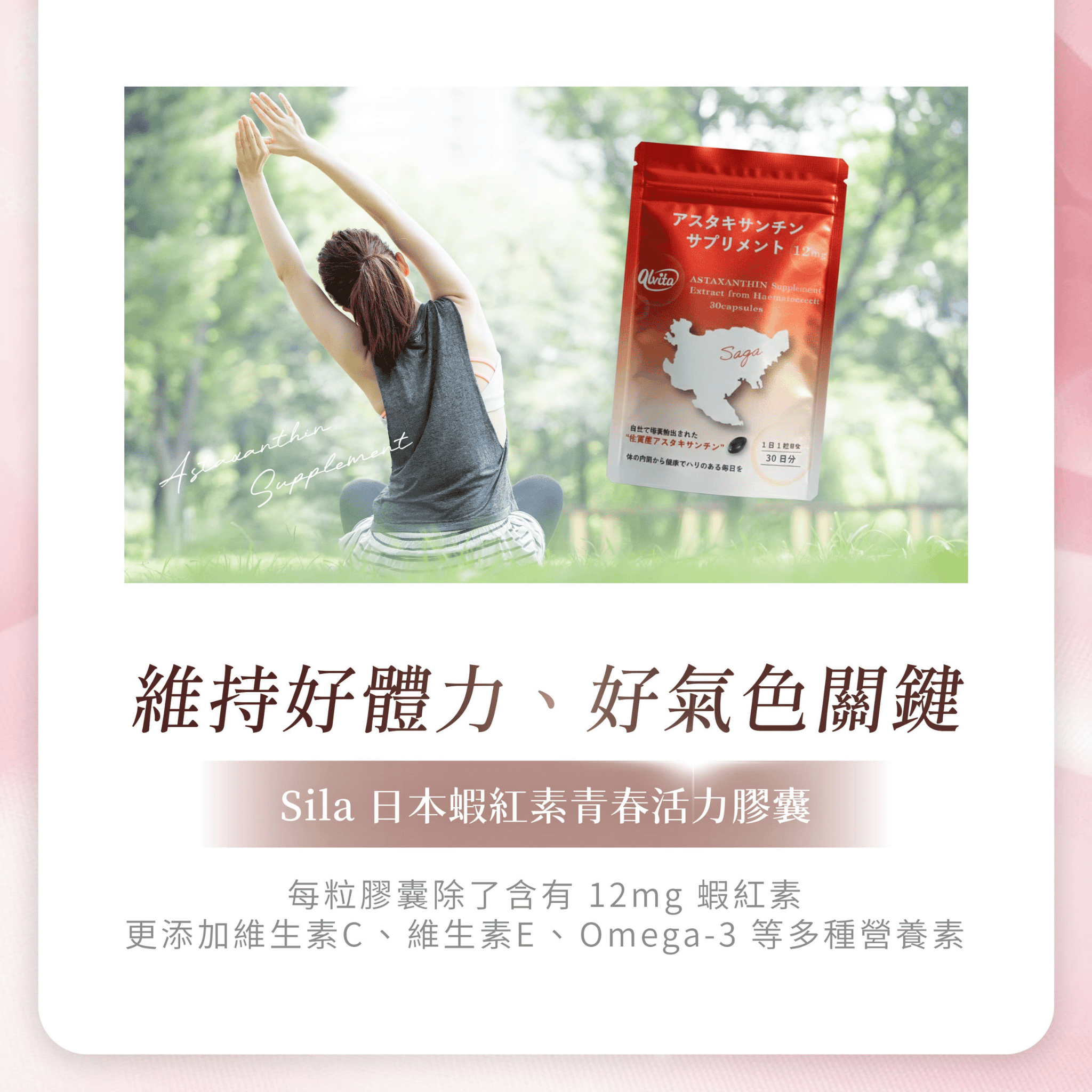 每 1 粒膠囊除了含有 12mg 蝦紅素,更添加維生素C、維生素E、Omega-3 等多種營養素,補充您每日所需的青春活力,維持好體力、好氣色。