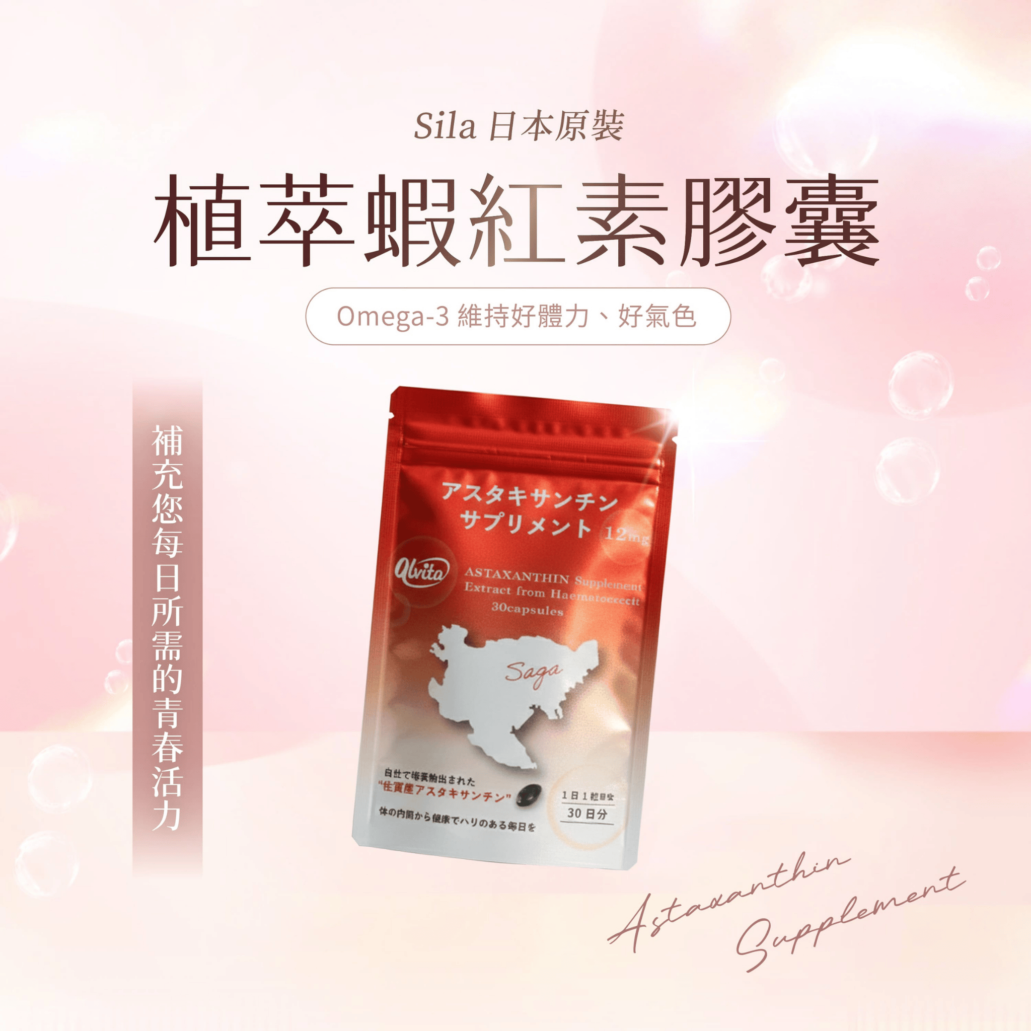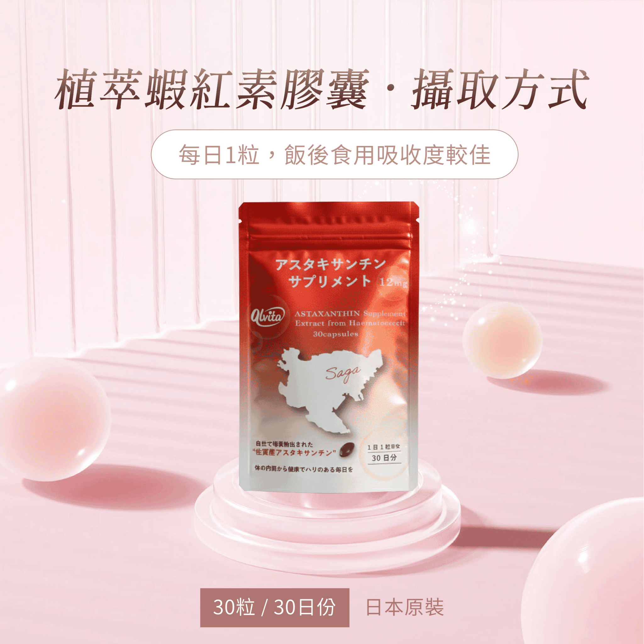 日本國產 Alvita蝦紅素(又稱藻紅素、蝦青素),每顆含 12mg 蝦紅素 (藻類萃取物 240mg),每天只需 1 粒 即可攝取含量豐富的蝦紅素。